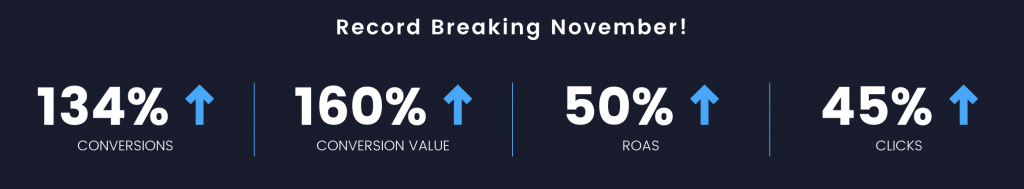 November has been the busiest month any of us have ever experienced, not to mention our clients. The Christmas, Black Friday and Cyber Monday campaigns have kept the marketing team on their toes but the results are outstanding. The results speak for themselves, the stats below are all campaigns run in our Google MCC account in November.
