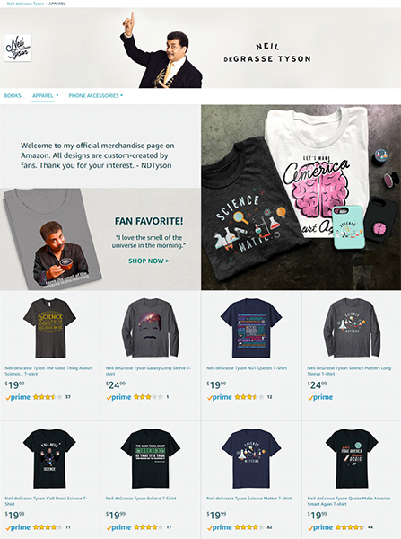As you can see from Neil deGrasse Tyson’s Apparel category page below, they’ve included an introduction to the products, a customer quote and strong imagery.
