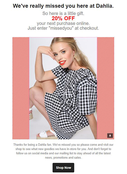As you can see in the example below, Dahlia let’s their inactive subscribers know that they’re missed. They’ve also featured a generous incentive to help win them back. It comes across as a friendly message, although it could be slightly improved with personalisation that includes the subscriber’s name.