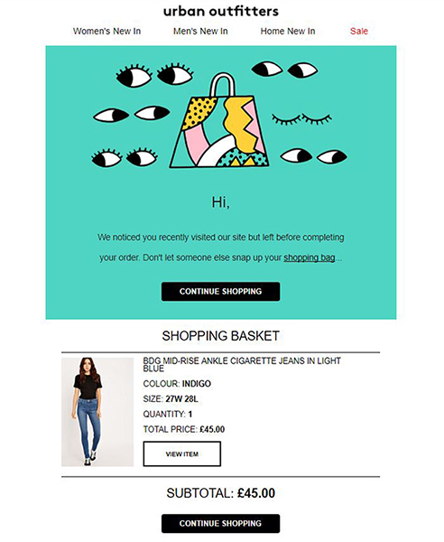 As you can see below, Urban Outfitters have used a casual and friendly tone in a short reminder message that includes a link to complete their order. They’ve also included two CTA buttons; one that lets them view the product and one that let’s them continue shopping. Although these aren’t essential to include, it gives recipients more options and could even lead to a bigger order value.