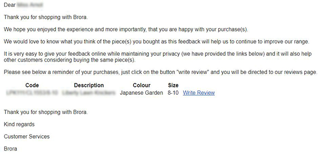 Make it easy for them to do this, and let them know that you value their feedback. As you can see in the example below, Brora has explained why the customer’s opinion matters to them and they’ve left clear instructions on the review process. Although these are good points, they’ve only explained why the feedback benefits This isn’t a great way to persuade customers; instead they could include an incentive such as free shipping on their next order. The email could also be improved though by adding strong imagery. Post-purchase emails should help generate a lasting impression, and this one doesn’t evoke a sense of excitement!