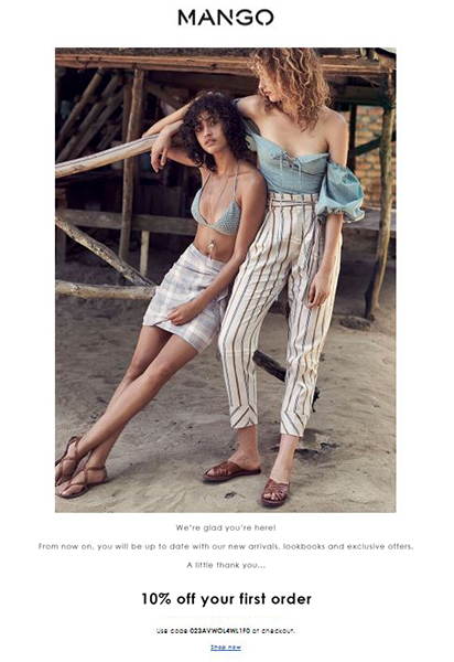 The first email usually thanks the subscriber for signing up and should also let them confirm the subscription. This should be a fairly simple email so they don’t get distracted from the double opt-in process, which you want them to complete! They should then receive a follow-up email that acts as a friendly welcome and explains what to expect from their subscription. A good example of this is Mango’s welcome email, which has a personal tone and gets the subscriber excited about what’s to come in future emails. They’ve also included a discount code for subscribers to use on their first purchase. This is a good reward for sign-ups, and increases the likelihood that they’ll open future emails from you.