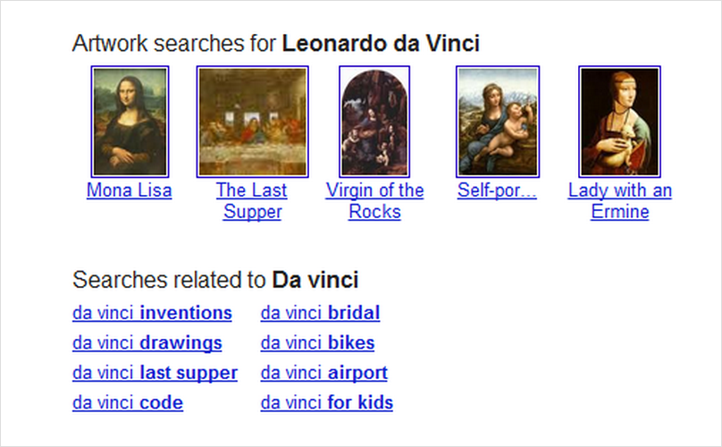 For example, if we do a search in Google for Da Vinci, we get page 1 results pertaining to Leonardo Da Vinci. At the bottom of the results, we get an area which discusses: “Artwork Searches for Da Vinci.” Here we have image results of famous work by the artist which is an indication by Google that they understand that Da Vinci was an artist or painter who was famous for producing masterpieces such as the Mona Lisa and the Last supper.