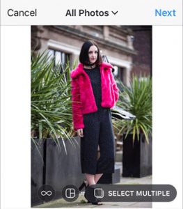 When you click on the button to upload onto your feed, you’ll see a ‘select multiple’ option alongside the boomerang and collage icons. You can then choose the images and videos you want to upload from your mobile’s library. The order of images can be changed by simply tapping and dragging, and you can edit the images either as a whole or individually.