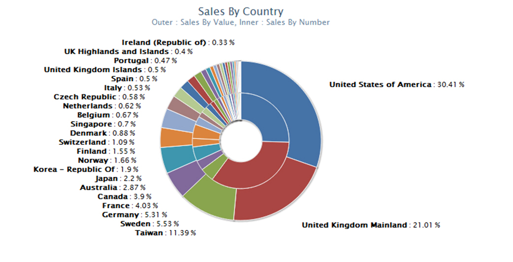 Amazingly, the UK accounts for only 21% of their actual online sales, with around 79% coming from other countries across the globe. That is huge and really does highlight the opportunities available right now for ecommerce retailers to take their businesses global. Granted, this is one of our clients whose products are desirable abroad, especially in the US, but what a market to consider and target based on customers and sales analysis.