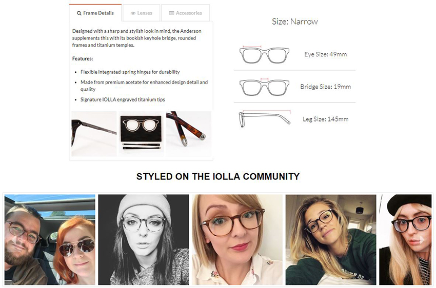 Eyewear brand iolla features an Instagram gallery on their product pages. This gives the impression that iolla values their customers and can help reassure potential customers who are hesitating about making a purchase. For example, they’ll be able to see which face shapes suit the eyewear they’re interested in.