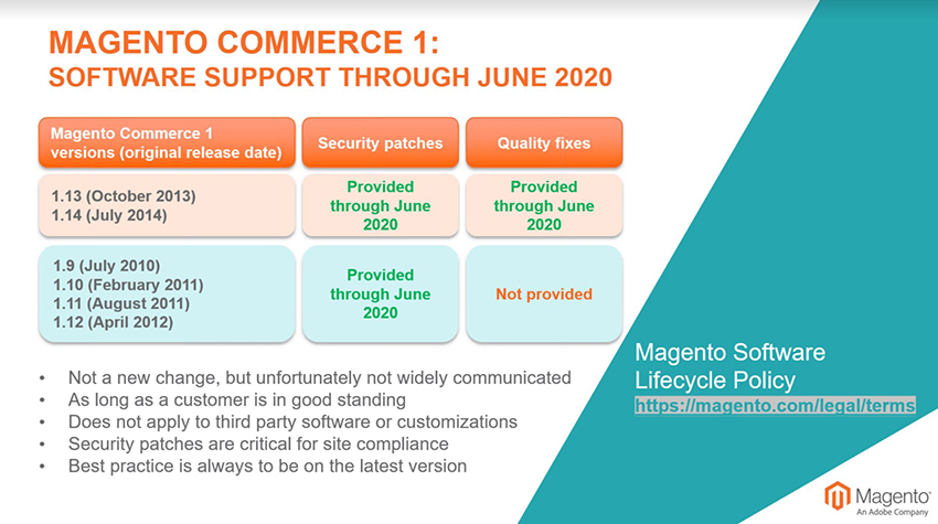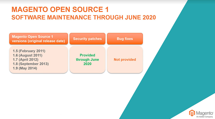 Today, Magento announced that software support for Magento 1 websites will officially end in June 2020. After this date, they will no longer provide merchants with security patches or bug fixes for any version of Magento Commerce 1 or Magento Open Source 1. Bug fixes for certain versions are already no longer available. Take a look at the tables below to see how your version of Magento 1 website is supported.