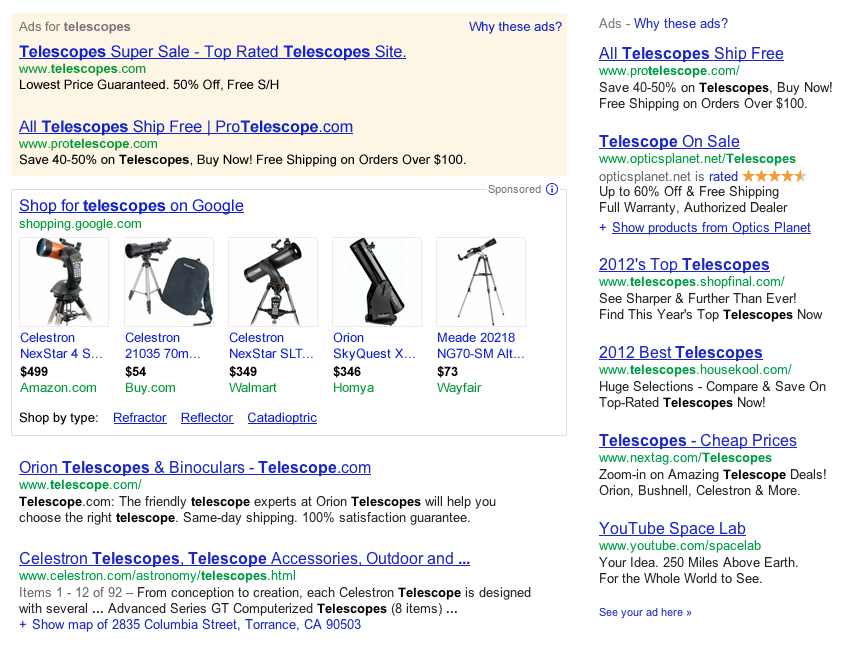 In this example, the images are of telescopes and are positioned at the top of the organic search results, note the word sponsored in the top right.