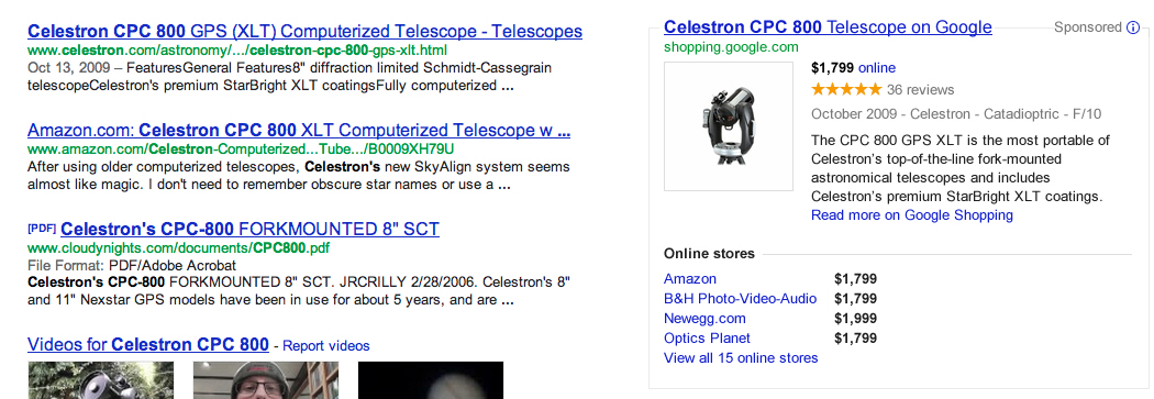 Additionally, if people are looking for a specific product, i.e. Celestron CPC 800 (image from Google, thanks), they might also see a new design that summarises information about that particular item as below: