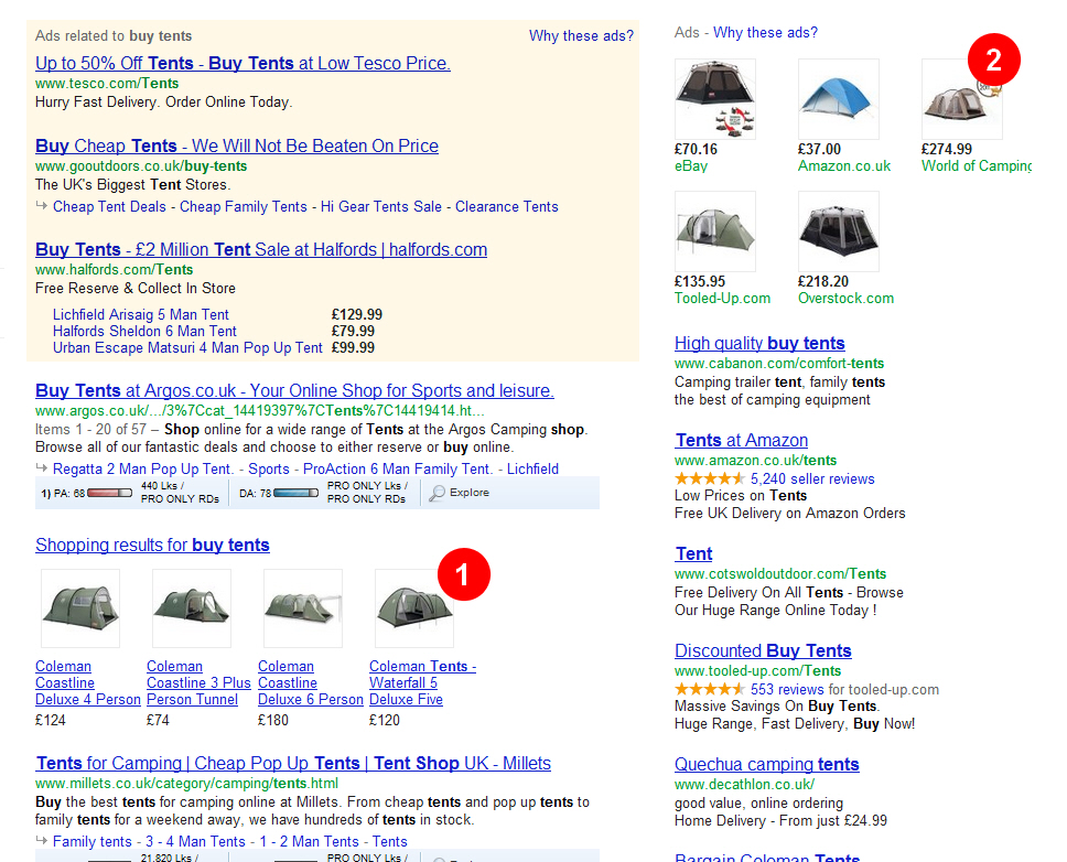 As the image above shows, the shopping results under number 1 are displayed in Google organic search and are taken from various merchant’s product data feeds. These results are currently ranked in Google free of charge. These results are not to be confused by the images displayed under number 2. These are Google AdWords product extensions / product listing ads. Merchants that currently advertise using Google AdWords can also link up their product data feeds within their Google Merchant Centre to their Google AdWords account by adding in a product extension / product listing ad to their AdWords campaigns. This will then link a merchant’s products to their chosen Google Ad and display it like the example above.
