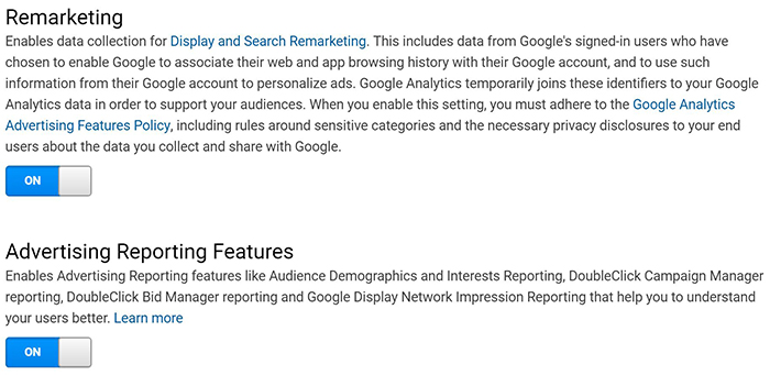 If you’re unsure about whether your Google Analytics account is setup to collect data for advertising, there’s an easy way to check. Firstly, go into the admin panel of Google Analytics, then find the Property column and click Tracking Info > Data Collection. You’ll then see two toggles which will indicate if you’re enabling data collection for Remarketing and/or Advertising Reporting Features. If these toggles are enabled (as shown below) then you need to check your privacy policy is fit for purpose.