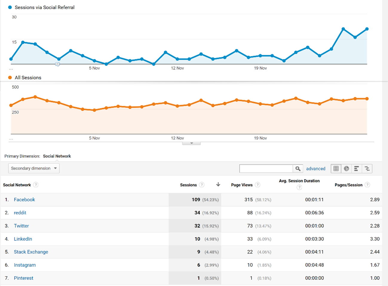 Underneath the graphs you’ll find one of the most valuable sections for social media metrics. This shows you a breakdown of the interactions that come from each social channel. The sessions and pageviews data allow you to see the amount of traffic gained, although what’s more important is the stickiness of the visits which can be measured by looking at the average session duration and the number of pages viewed per session.