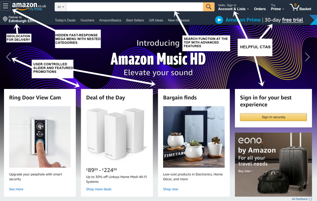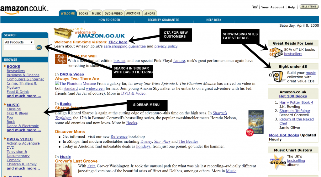 Amazon is now a giant and is often cited as being one of the most influential sites with respect to UX Design. This is due to things like the product reviews, one-click order, free delivery and it’s massive stock which is easily navigable through nested categories and multi-access search functions.
